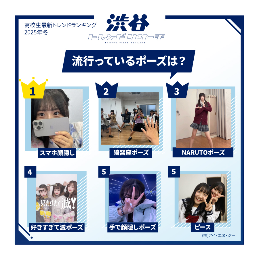 1位は「スマホ顔隠し」がランクイン。「一番盛れるから」(高3・女子)といったコメントが多く寄せられたほか、「BeRealの影響」(高2・男子)、「TikTokのインタビューでやってる子が多い」(高2・女子)など、SNSで頻繁に使われている様子がうかがえます。2位には、アニメ映画『劇場版「鬼滅の刃」無限城編 第一章 猗窩座再来』で上弦の鬼・参として登場する「猗窩座(あかざ)」のポーズがランクイン。「文化祭や体育祭でも流行った」(高3・男子)、「写真を撮る時にそのポーズをする友達が多い」(高1・女子)など、イベントの場で“みんなで盛り上がれる”ポーズとして人気を集めています。3位は「NARUTOポーズ」。TikTokをきっかけに再燃している、ロックバンド「KANA-BOON」の「シルエット」に合わせて踊る “ナルトダンス” の流行とともに注目が高まりました。アニメ『NARUTO-ナルト-疾風伝』のオープニングテーマとしても人気があり、「“いっせーのーせ”の曲とダンスが流行ってる」(高2・女子)といった声が寄せられ、写真撮影時のポーズとしても流行しているようです。