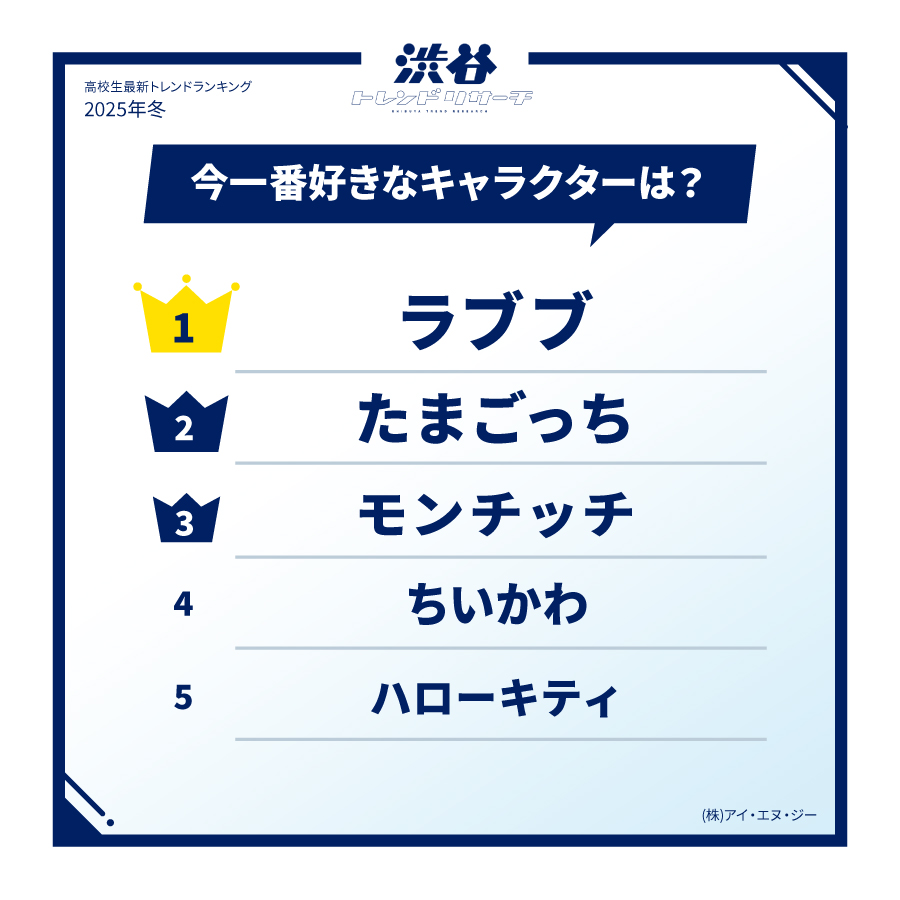 中国発の“ブサカワ”キャラクター「ラブブ」が、特大号で3号連続となる1位をキープしました。「バッグに着けている子が多い」(高3・女子)、「修学旅行で買った」(高1・女子)といった声が多く寄せられ、引き続き高校生の間で強い人気とブームを維持していることがうかがえます。