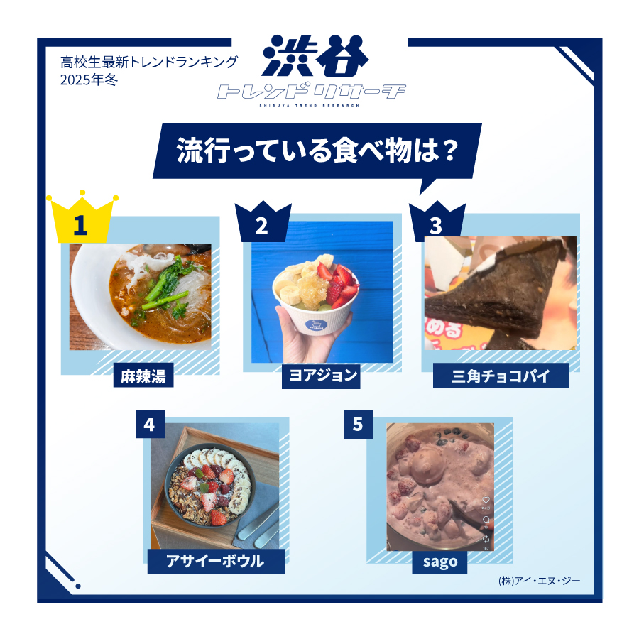 もはや“殿堂入り”の「麻辣湯」が1位にランクイン。ヘルシーさに加え、好きな食材を自由に選べる点や専門店の増加も相まって、長期間にわたり高校生から支持を集めています。2位には「ヨアジョン」が初登場。ヨーグルトアイスにフルーツやシリアル、ナッツ、はちみつ、チョコレートなどをトッピングして楽しむ韓国発のデザートで、「新しい店舗が増えている」(高2・女子)、「新大久保で食べたらすごくおいしかった」(高3・女子)などの声が多く、女子高校生を中心に人気が急拡大しています。3位には、マクドナルドで期間限定販売されている「三角チョコパイ」がランクイン。 「冬の定番で、何度も食べに行ってる」(高1・男子)、「ティラミス味が話題になってる」(高3・女子)など、毎年の季節恒例スイーツとして支持を集めている様子がうかがえます。
