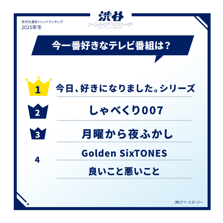 「今日、好きになりました。」シリーズが、特大号で3号連続の1位を獲得。「男女どちらも観ている」(高1・女子)、「毎週、新エピソードの翌日は必ず話題になる」(高2・男子)など、多くの声が寄せられました。2025年年末、高校生の間では空前の“今日好きブーム”が巻き起こっています。