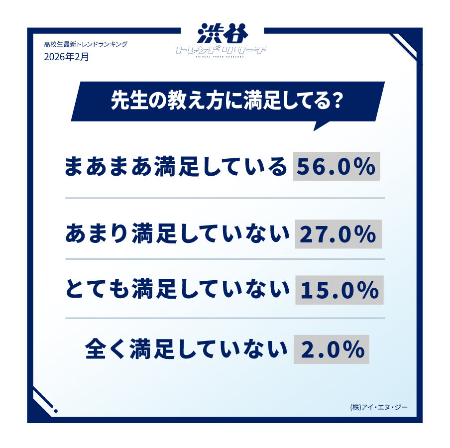 「先生の教え方の満足度」を聞いたところ、半数を超える83.0%が「とても満足している」「まあまあ満足している」と回答する結果となりました。満足している生徒からは、「授業が面白く、質問にも丁寧に対応してくれる」(高3・男子)、「具体的な資料や教科書に載っていない情報を提供してくれるので、イメージが湧きやすく理解が深まる」(高3・男子)といったエピソードが寄せられました。先生独自の工夫が、生徒の学習意欲に直結している様子がうかがえます。一方で、「先生によって差が激しい。どこを解説しているのか不明確だったり、字が読めなかったり、すべてタブレット任せの先生もいる。その反面、丁寧に補習をしてくれる先生もいる」(高1・女子)や「数学などの難解な授業で、独り言のように喋っていて理解できない」(高2・男子)など、教え方の質にバラつきがあることへの不満の声も挙がる結果となりました。