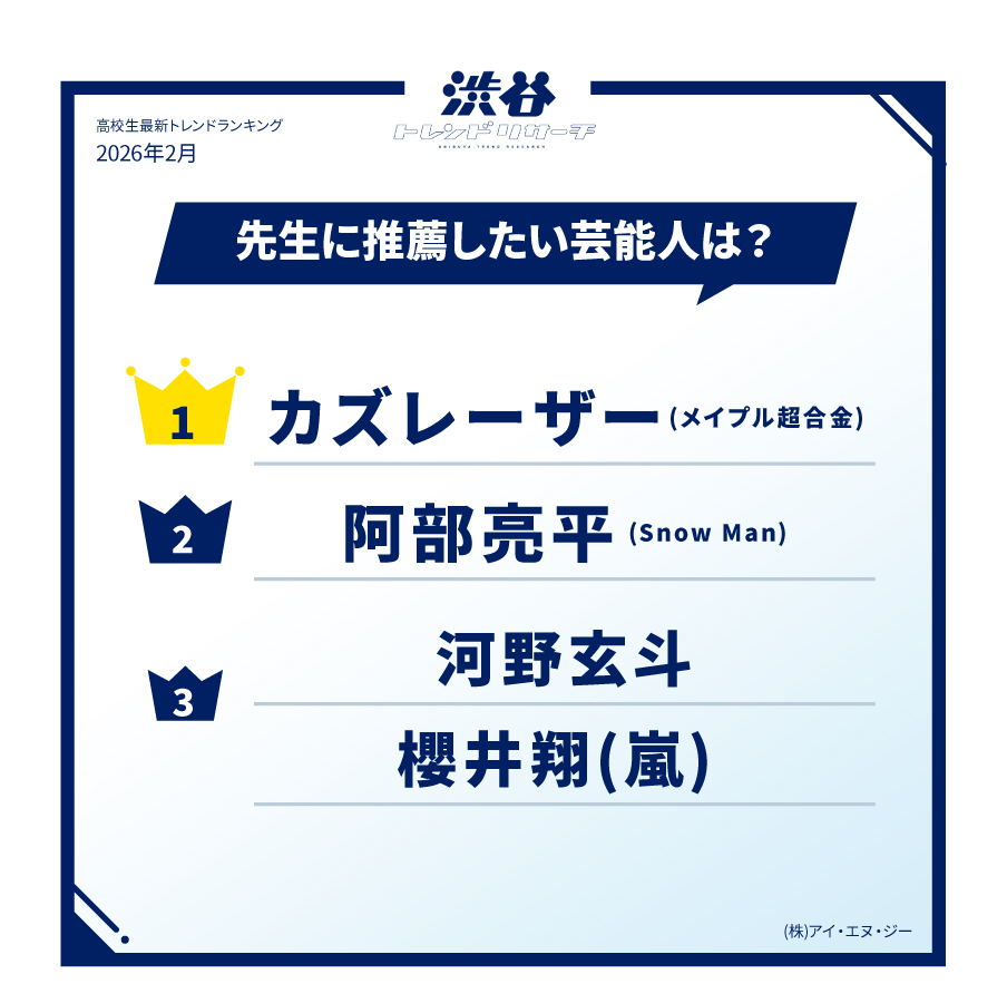 1位には「カズレーザー(メイプル超合金)」が輝きました。「面白さも知性も兼ね備えていて、授業を受けたら楽しそう」(高2・女子)といった声が多く、圧倒的な知識量とユーモアを併せ持つキャラクターが支持を集めています。2位には「阿部亮平(Snow Man)」がランクイン。「すごく物知りだし、優しく分かりやすく教えてくれそう」(高1・男子)という意見が多数寄せられました。高い学歴だけでなく、誠実な人柄や端正なビジュアルも、理想の先生像として人気を博しているようです。同率3位には、知的な芸能人の代名詞として定着している「櫻井翔(嵐)」に加え、教育系YouTuberとして絶大な人気を誇る「河野玄斗」が登場しました。「櫻井翔(嵐)」に対しては「ニュース番組での解説が分かりやすい」といった信頼感が寄せられる一方で、「河野玄斗」については「普段からYouTubeで動画を見ている」(高3・女子)という声も多く、学習の参考にSNSや動画を活用している高校生の日常がうかがえる結果となりました。